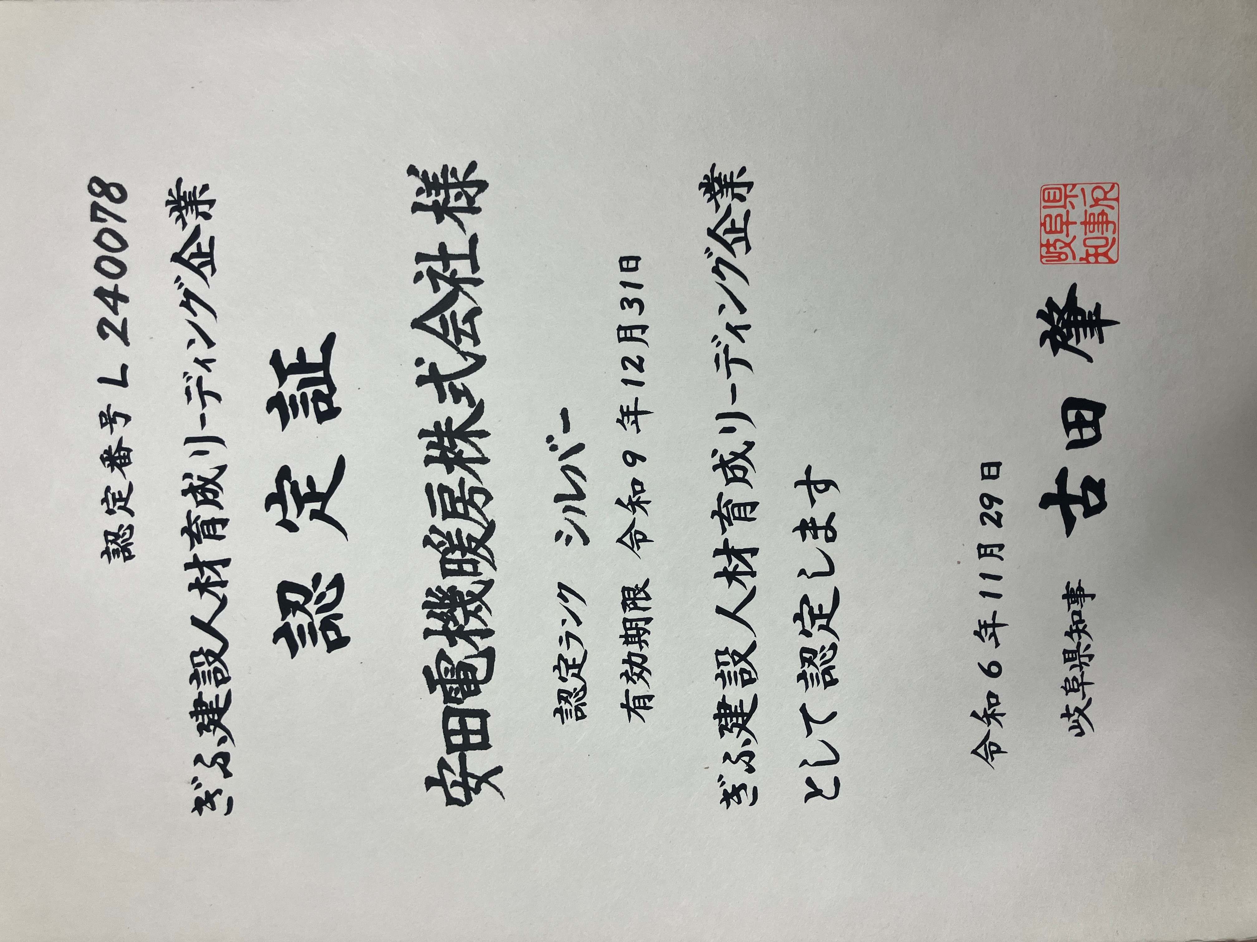 『ぎふ建設人材育成リーディング企業』シルバーの認定をいただきました。