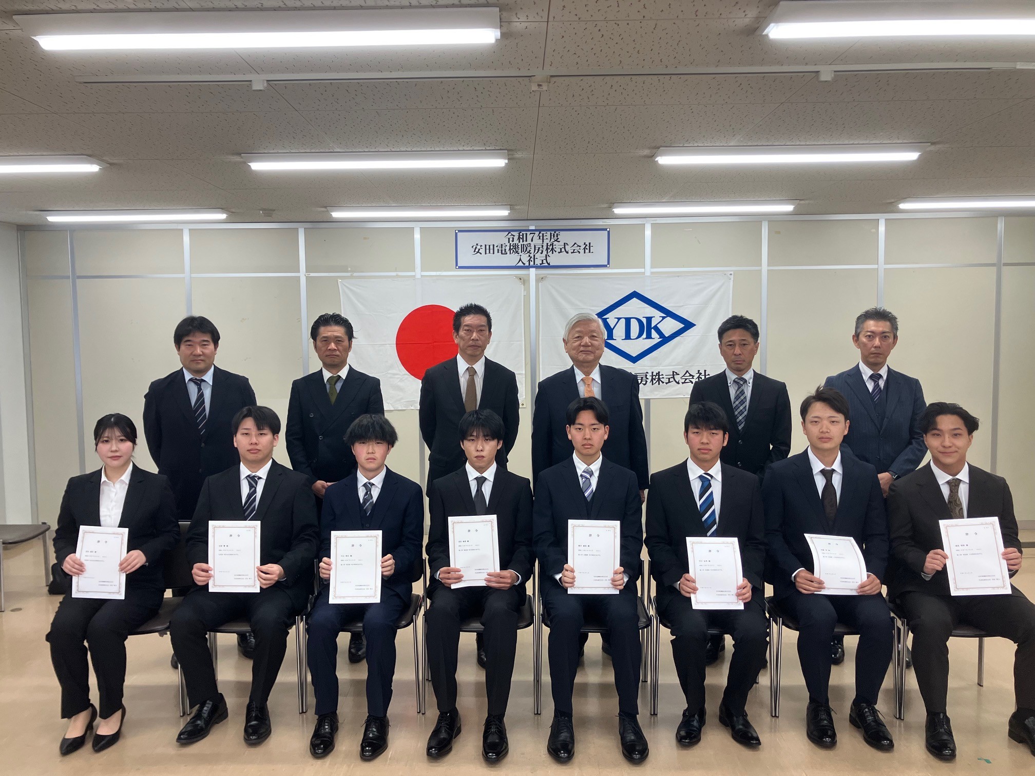 4月1日 令和7年度 入社式を執り行いました。 今年度は営業職として2名、施工管理職候補として6名の計8名が弊社に入社いたしました。 新入社員が今後 技術を磨き、お客様のお役に立てる日が早くくるように、期待しております。