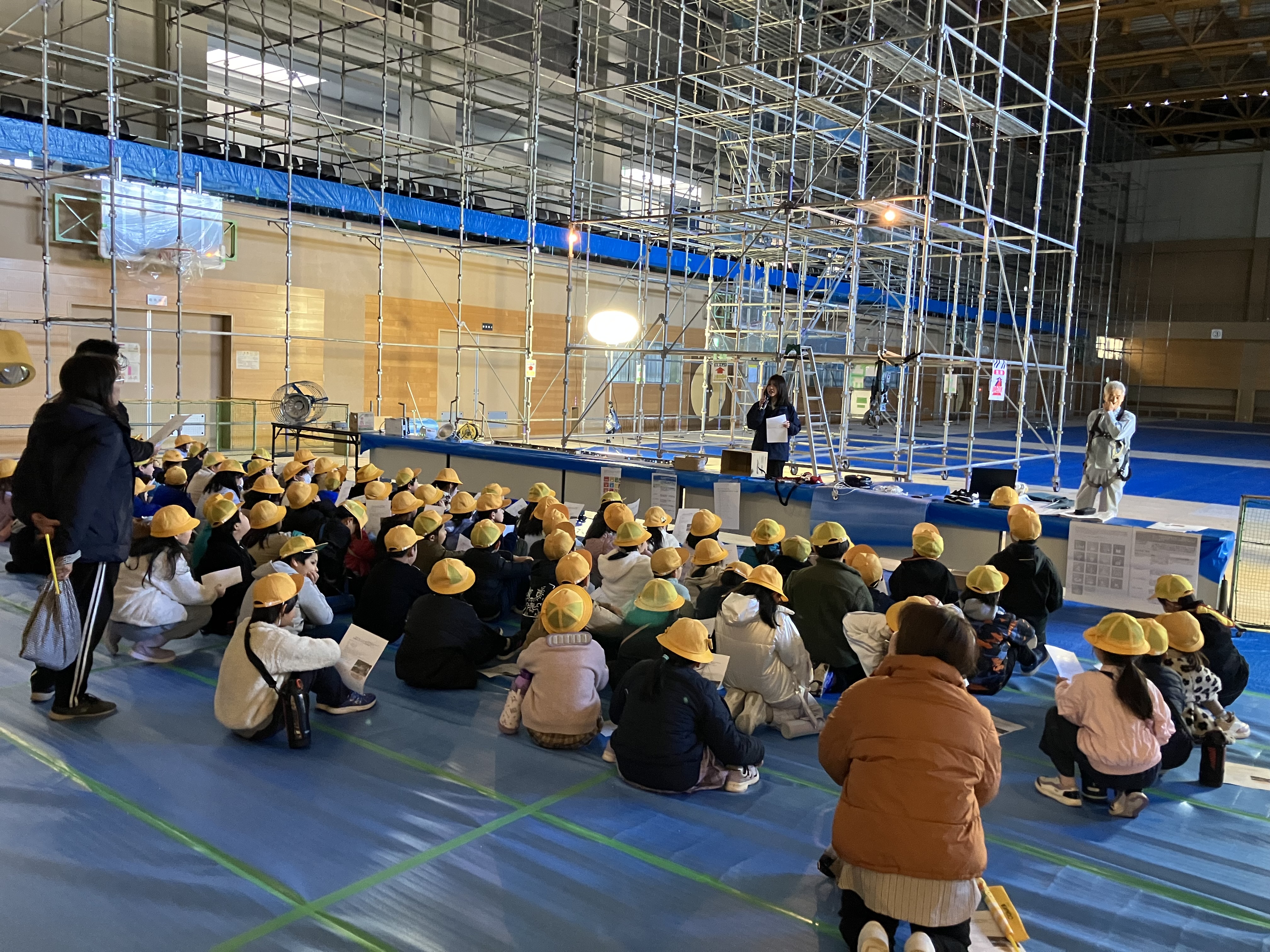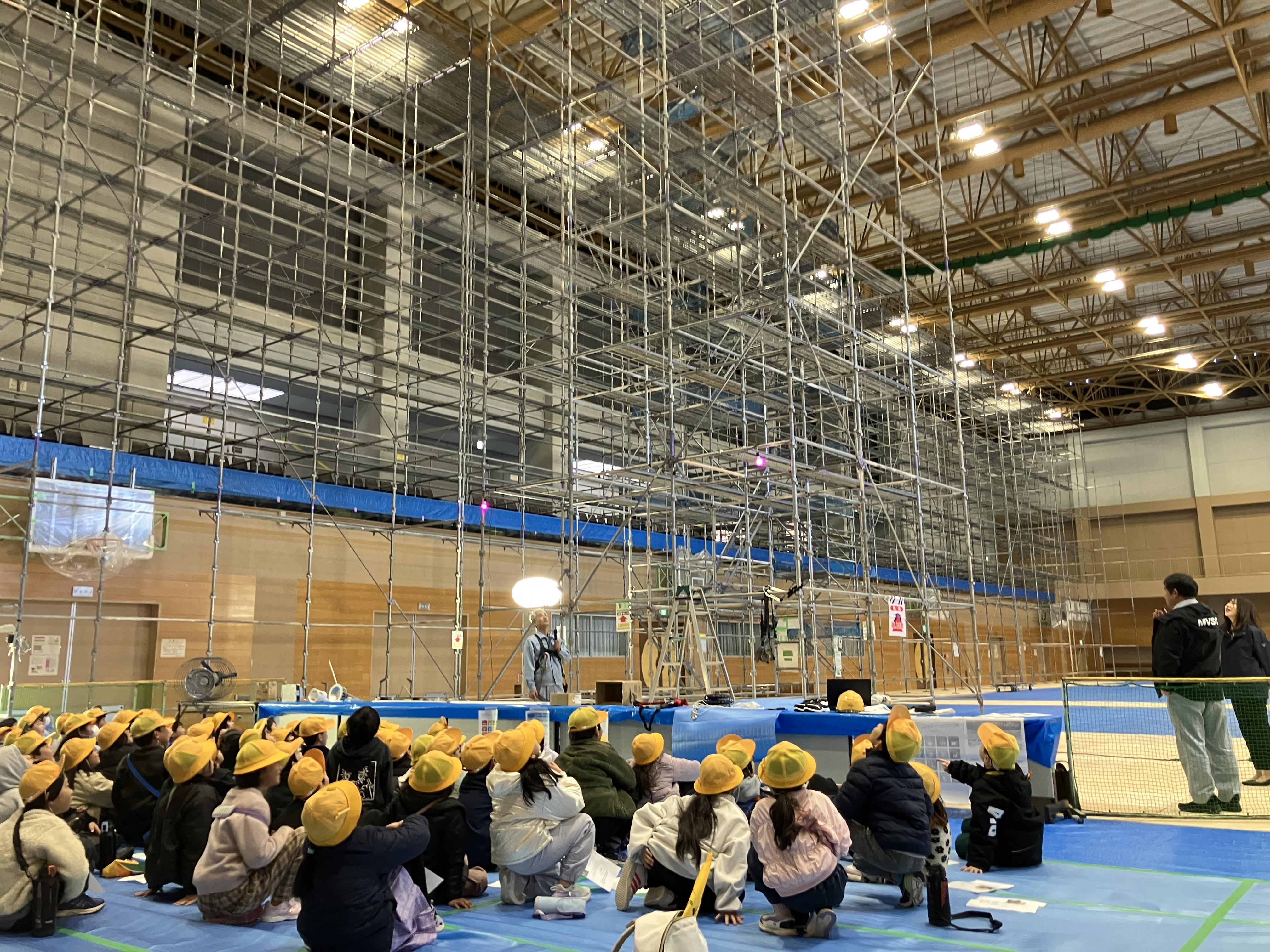 各務原市様より受注し、施工中の『各務原市総合体育館照明設備改修工事』において、1月22日(木)に現場見学会を開催いたしました。 各務原市立那加第三小学校 3年の生徒を招き、LED照明器具や工事を行なうための道具等の説明をした後、現場を見学しました。 見学会にきてくれた生徒が、建設工事に興味をもってくれたら幸いです。 今後もこのような機会があれば、見学会を開催していきたいと考えております。